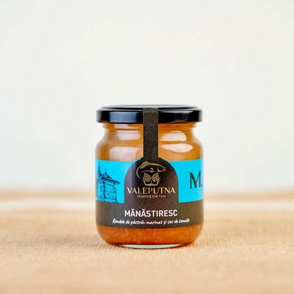 Ingrediente: rondele de păstrăv marinat (62%), pastă de tomate (15%), apă, oțet, zahăr brun, ulei de floarea soarelui, piper alb măcinat, foi de dafin, usturoi, sare.