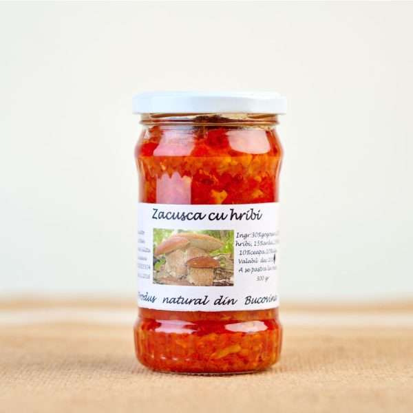 Bucură-te de zacusca cu ghebe, o delicatesă autentică, preparată după rețete străvechi ale hutulilor, în inima Bucovinei. Gătită la foc domol de lemne, așa cum se făcea odinioară, pentru a păstra intactă bogăția de arome și gustul natural al ghebelor sălbatice. Îmbinând legumele proaspete cu ghebele culeșe din pădurile dese, fiecare borcan aduce cu sine o parte din tradiția și autenticitatea Bucovinei. Ideală a fi servită pe pâine proaspătă, ca gustare sau aperitiv, sau ca parte a unui platou cu brânză locală și mezeluri.